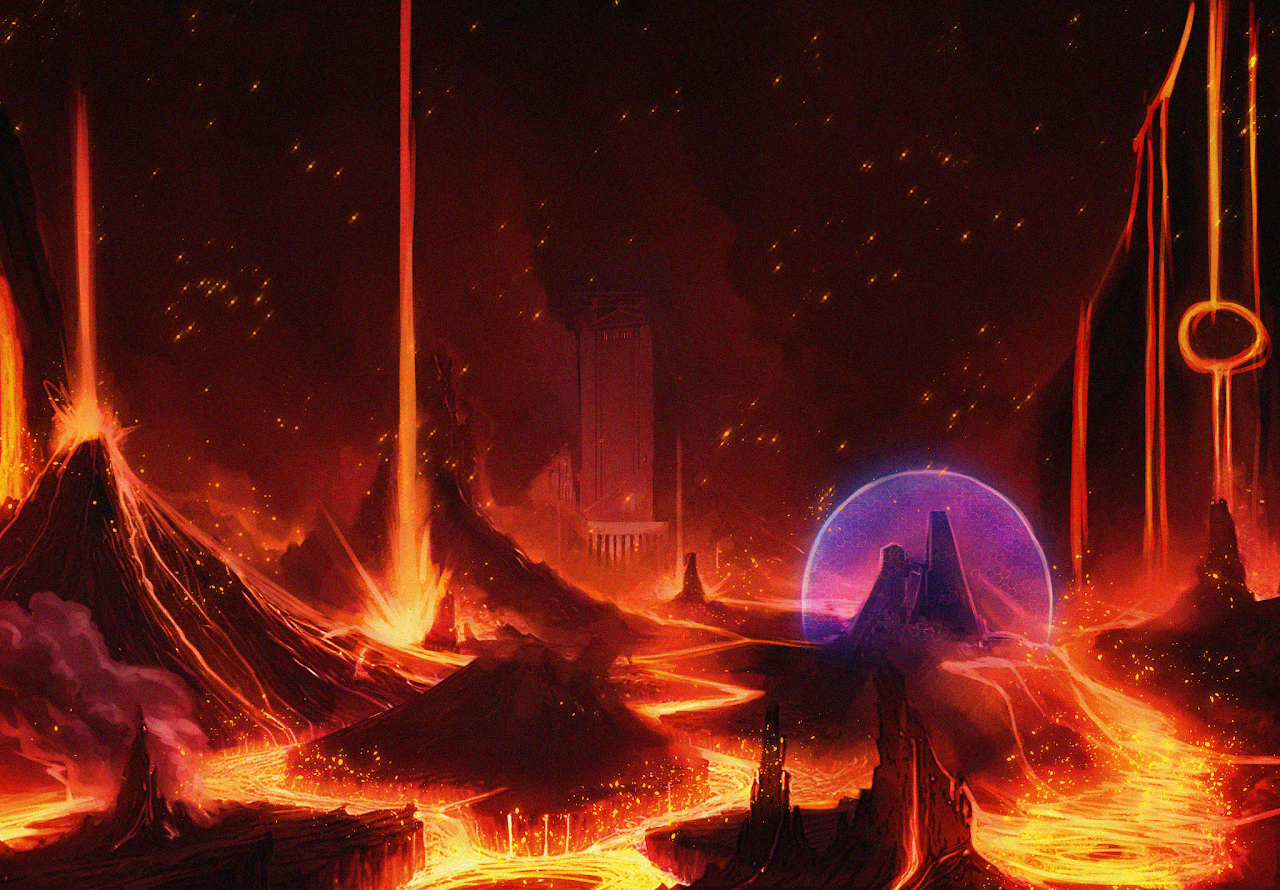 A fiery and tumultuous world where volcanoes roar with fury and rivers of lava twist like serpents in all directions. As the planet closest to its sun, Erdiatrum receives almost no sunlight due to its perpetually clouded skies. This planet, owned by the Nexusterra, is also used for mining operations. It has colonies equipped to endure the extreme heat and the hazards posed by magma and other environmental challenges.
