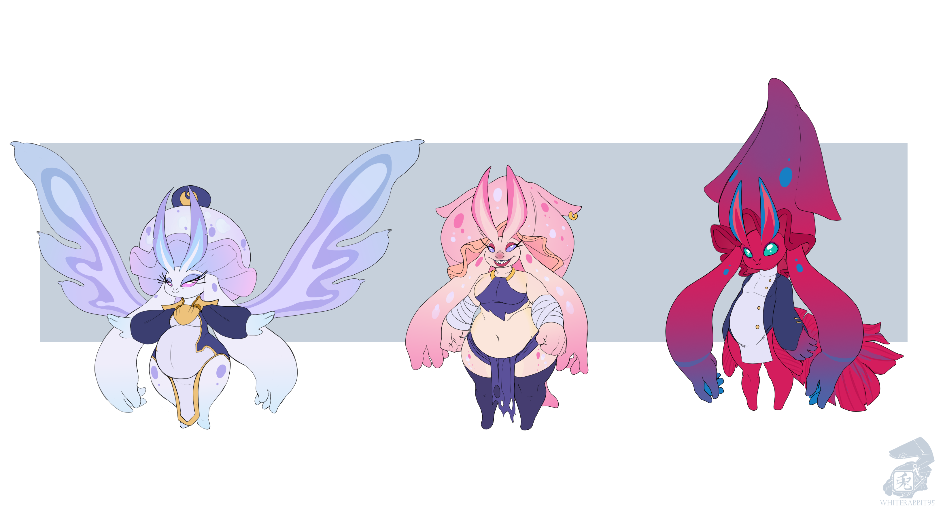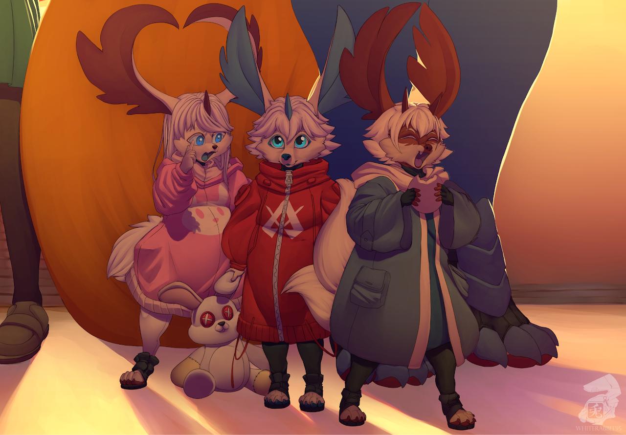 Despite their mutated nature, they retain some aesthetic traits of their Vulparesu lineage, pastel toned skin, a large fluffy tail absent in their ancestors, and a variety of single or double horns. Along with long hair that ranges from fiery orange to deep crimson or scorched gold. However, what truly sets them apart are their four ears, arranged in two sensitive pairs that allow them to pick up sounds from kilometers away. This is paired with adaptive eyes capable of detecting movement in darkness or spotting a hidden target in the brush as though it were fully exposed.
