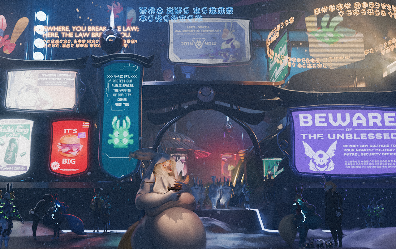 Enough reason to grant them just the right amount of freedom to keep them distracted, immersed in consumption and base desires, as long as they stay obedient. Every Vulparesu is registered, watched, categorized. They are fast. Social. Trainable. Perfect cannon fodder. They respond as a pack. They don’t question the purpose and their obedience is a conditioned reflex from birth.